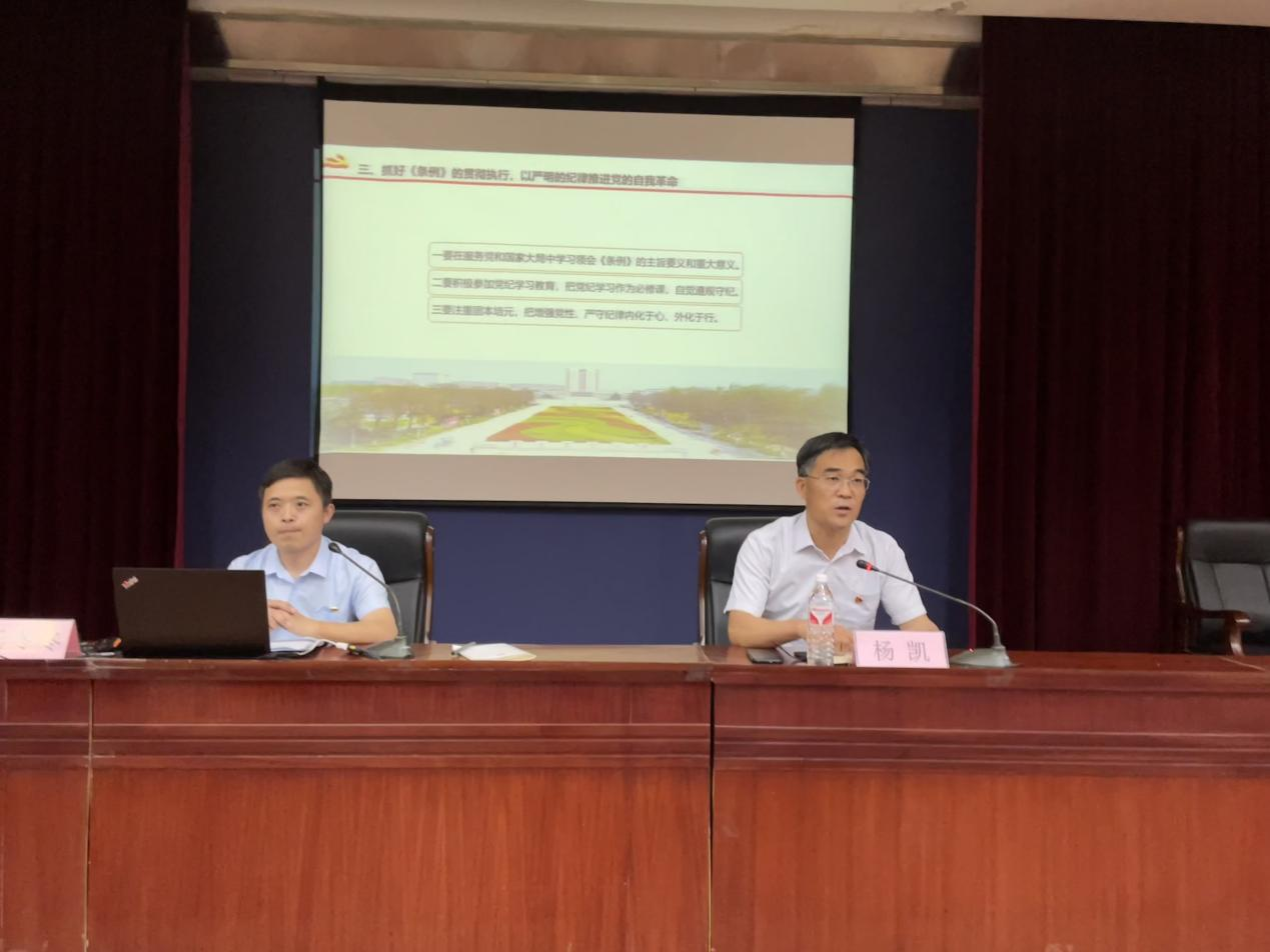 会上,杨冬冬从“充分认识学习宣传贯彻《条例》的重大意义”、“准确把握《条例》修订的主要内容和精髓要义”、“抓好《条例》的贯彻执行,以严明的纪律推进党的自我革命”三个方面阐述了《条例》的重点内容。随后,杨冬冬从《条例》的指导思想、纪律处分工作、“四种形态”、纪法衔接四个方面进行具体讲解,通过列举具体案例,体现出党和国家对违反政治纪律行为零容忍的态度和《条例》发挥的纪律建设标本兼治作用,提醒党员干部以例为鉴,警钟长鸣。接着,杨冬冬指出,要想严肃党的纪律,纯洁党的组织,各级党委就要抓好《条例》的贯彻执行,以严明的纪律推进党的自我革命。最后,杨冬冬对参会人员提出三点期望:一要在服务党和国家大局中学习领会《条例》的主旨要义和重大意义,用理论武装自身;二要积极参加党纪学习教育,把党纪学习作为必修课,自觉遵规守纪,把遵规守纪刻印在心;三要注重固本培元,把增强党性、严守纪律内化于心、外化于行。