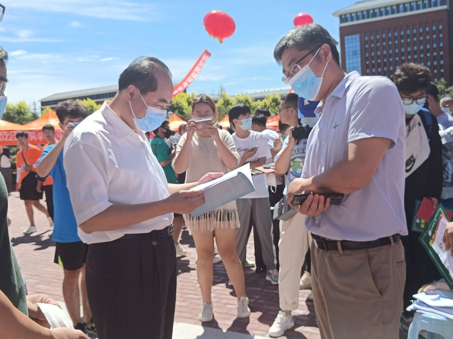 为保障员工的健康安全和迎新工作顺利开展,公司党委书记郭善利、董事长刘新民、公司党委副书记王庆军、公司党委副书记单连岱、副董事长牟少岩等公司领导莅临公司迎新现场视察指导,公司党委书记杨凯向校领导汇报了公司迎新工作情况,详细介绍了员工报到的流程安排,确保员工安全有序到校。刘新民亲切地为新同学签字并拍照留念,祝福新同学在青农度过美好的大学时光。