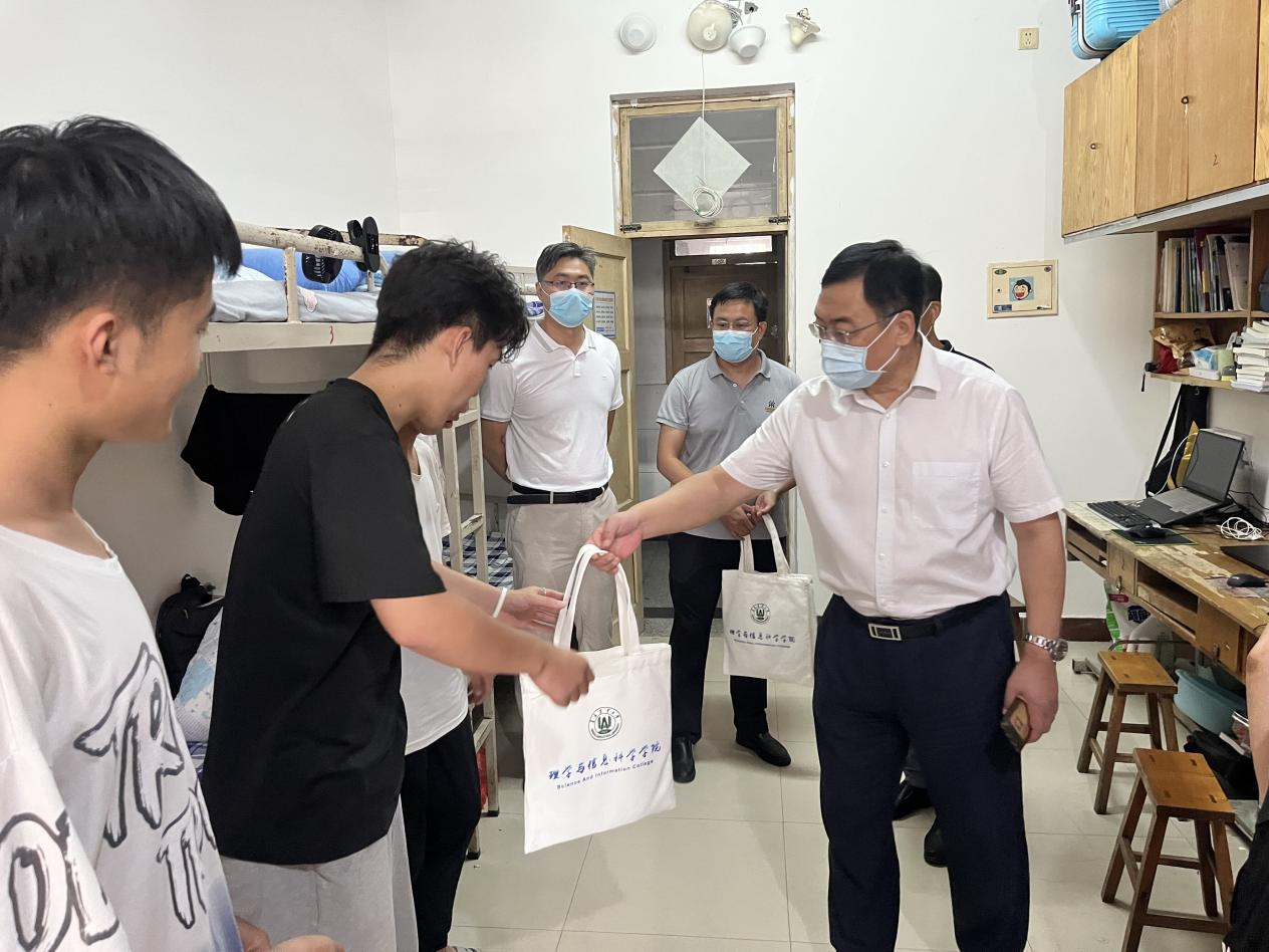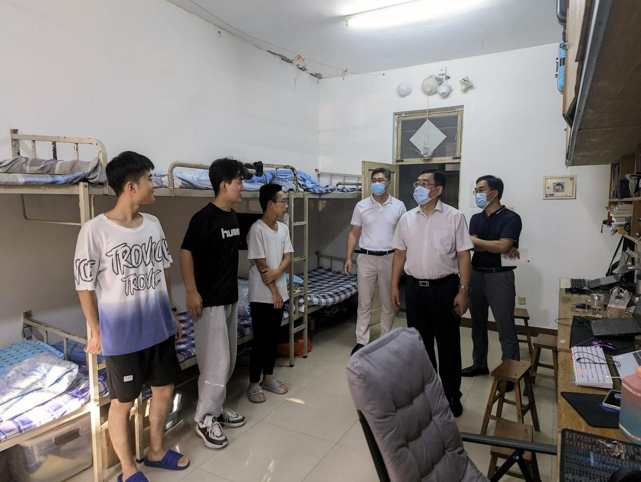走访过程中,王庆军与同学们亲切交流,详细询问同学们的日常学习和生活情况,了解大家的实际需求,并安抚同学们在疫情封校期间的情绪,督促同学们重视学习,合理规划学习时间。随后,他向同学们强调了疫情期间公司管理的相关规定,勉励大家积极响应配合公司疫情防控的部署安排,努力做好个人防护,重视宿舍安全和通风消毒工作,并提醒大家配合每天核酸检测,调整作息规律,养成健康有序的学习和生活习惯,学会及时与辅导员、班主任沟通交流学习生活中存在的问题。公司领导对同学们的身心健康等情况表示关切和慰问,叮嘱同学们要时刻注意保持宿舍的清洁卫生、通风通气,保持寝室内的干燥与整洁,及时规范地填写宿舍消毒通风记录表,并向同学们发放口罩等防疫物资。