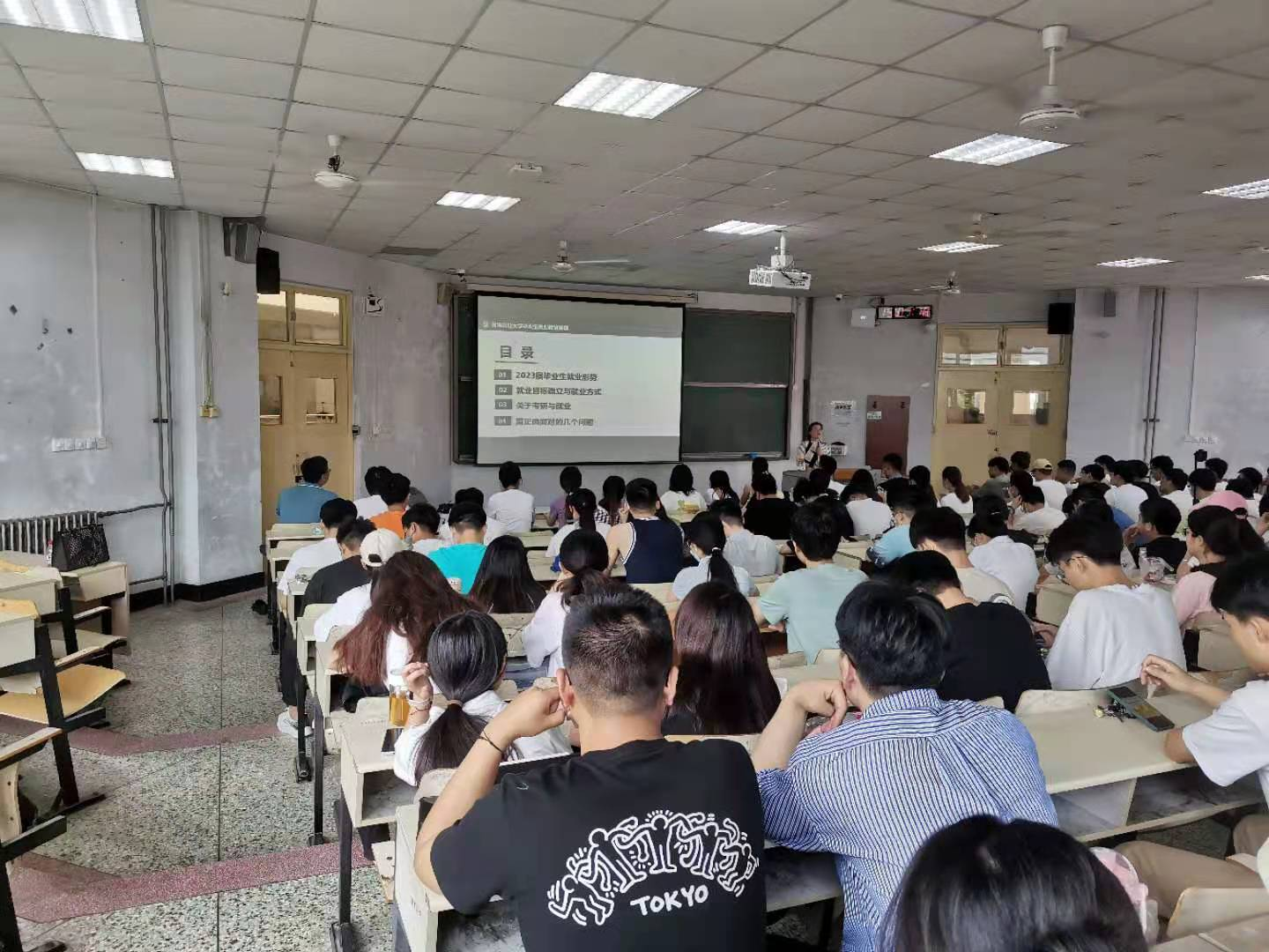 吕国莹详细介绍了2023届毕业生就业形势和疫情防控对就业的影响,并从就业目标的确立、考研与就业以及毕业生们需要正确面对的几个问题等方面进行了解读。她提到,疫情期间相比于往年就业人数更多,但线下的招聘会因疫情防控减少,就业压力不断加大。随后,吕国莹对秋季招聘会和春季招聘会进行了比较和分析,春季招聘会因考研考公结束就业人数的增加等原因,企业的整体质量和岗位丰富程度将不及秋季招聘会。最后吕老师对毕业生提出意见和建议,希望毕业生要主动了解就业形势,重视实践,多参加宣讲会和招聘会,不断提高自身阅历,积累就业面试经验,并对“考研”、“考公”、“二战”等相关问题做出了分析解读,使在场毕业生们受益匪浅。