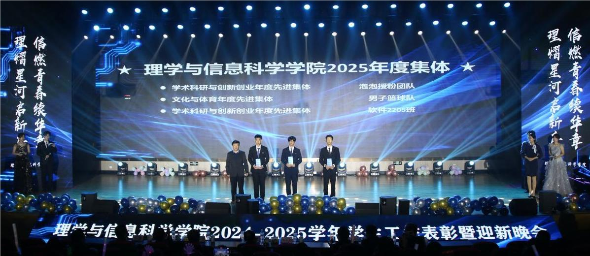 第三篇章“卓行逐光・向远方”以模特步态表演《玄步逐光》重燃现场氛围,表演者身姿挺拔、气质出众,以肢体语言融合时尚元素与青春活力,凸显理信学子独特风采;朗诵《成为一束光》气势激昂,以庄严表达传递老员工对理想信念的坚守;随后,25级辅导员、班助和员工会成员联合呈现歌舞表演《让我们一起出发》,在轻快的旋律与热烈的氛围中,展现当代青年携手共进、勇赴前程的精神风貌。随着现场氛围升至高潮,晚会进入2025年度人物与年度集体表彰环节。