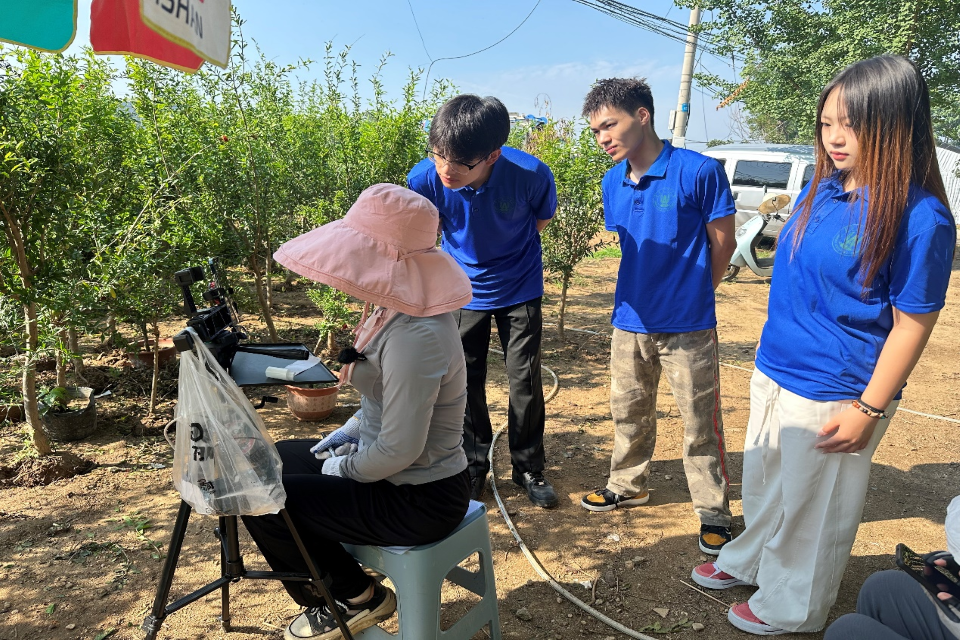 7月17日,实践团成员抵达电商直播孵化基地,开启了系统性的学习与实践环节。对于研究生而言,专业主播的直播技巧蕴含着丰富的传播学与市场营销学原理。他们从开场问候的情感连接策略,到产品卖点提炼的消费者心理学应用,再到互动话术设计的传播学逻辑以及应对突发状况的危机管理技巧,都进行了细致的学术化记录与分析。在充分吸收专业经验后,实践团成员走进直播间,运用数字媒体专业知识,向观众全面介绍石榴树和枣树的种植优势。他们从土壤学角度解析土壤肥沃度,结合气象学知识阐述气候条件对果实品质的影响,更通过叙事性传播方式展现果农的精心照料过程。这种将专业知识与传播技巧相结合的直播模式,旨在从学术实践层面探索拓宽农产品销路的有效路径,为乡村产业振兴提供可复制的经验。