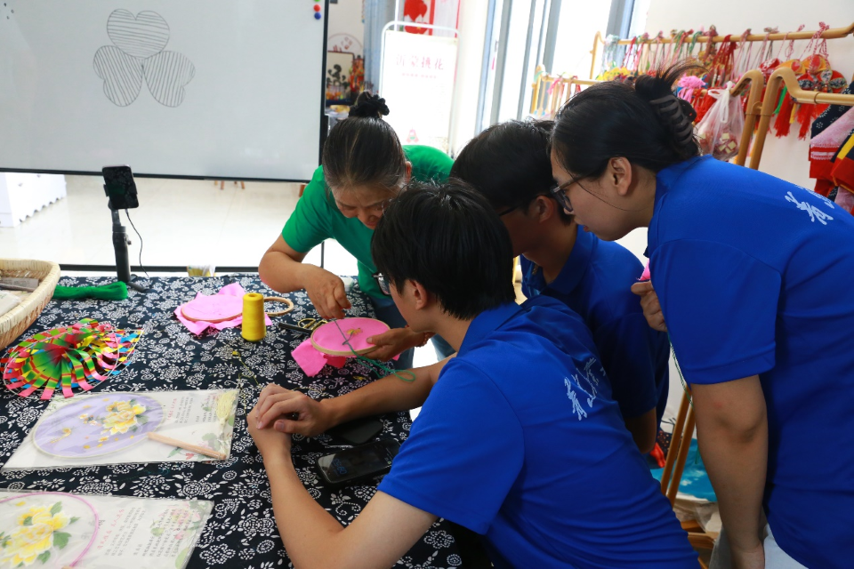 接下来,为了让实践团成员深入体验挑花工艺的魅力,邢爱芝开设了挑花小课堂——三叶草挑花。在课堂上,她手把手地传授这项指尖非遗技艺,毫无保留地讲述挑花技艺的奥秘与技巧。研究生们在一针一线的实践过程中,深切感悟到沂蒙文化的独特魅力。通过亲身体验,他们不仅掌握了挑花的基本技法,更深刻理解了传统手工艺所蕴含的文化价值与匠人精神。这种亲身体验式的学习方式,对于研究生们从学术角度深入研究非遗技艺具有重要意义,能够帮助他们更好地理解技艺背后的文化逻辑与社会价值。